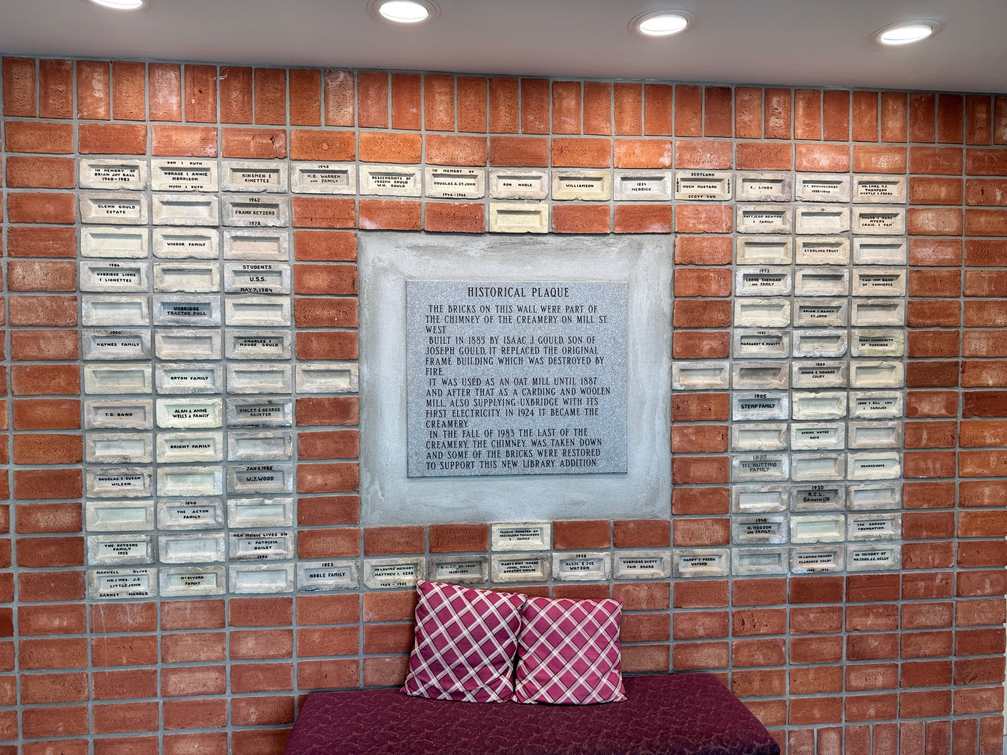 Eventually, the chimney, too, was taken down. But in true Uxbridge spirit, the memory of the creamery was not lost. When the chimney was demolished, the bricks were made available for purchase. Families could inscribe their names or dedicate them in memory of loved ones. These personalized bricks were then used to create a commemorative wall at the Uxbridge Public Library—a lasting tribute to the creamery and the generations of residents who were connected to it.