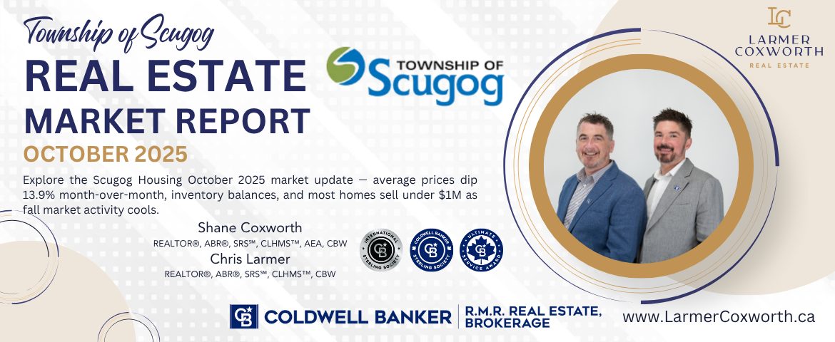 The Township of Scugog’s real estate market showed signs of seasonal cooling in October 2025, as average prices pulled back from September’s highs and sales activity levelled out. Despite softer pricing, market fundamentals remain healthy, with balanced conditions continuing to define the local landscape.