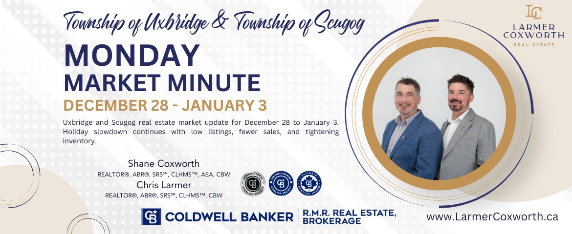 The final week of the year brought a seasonal slowdown to the real estate markets in both the Township of Uxbridge and the Township of Scugog. With the holidays in full swing, activity across both communities remained quiet—something we expect to see every year at this time.