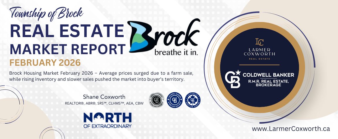 The Brock Township real estate market saw a notable jump in average sale price in February 2026, though the increase was largely influenced by a single high-value farm sale. At the same time, sales activity slowed and inventory levels increased, pushing the market back into buyer’s market territory.